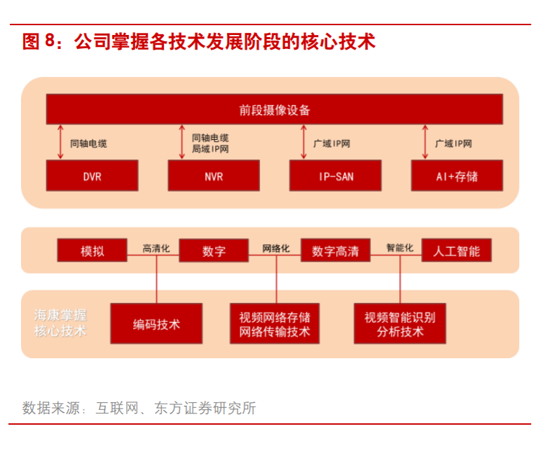 前期,海康威视以视频监控后端的音视频压缩板卡为主要业务,随后布局了前端、后端和控制中心的安防全产品线。