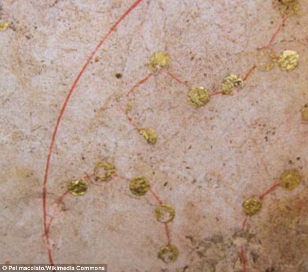 图上描绘了细致的星空,金色点阵描绘了68个星座,有可明确识别的星座图案、天文图表、坐标圈形等,因此,它被认为是现存最古老的正规星图。天文图的中间画着北极星,你还能在图上找出昴宿星、毕星团、处女座、天秤座、猎户座和北斗七星。