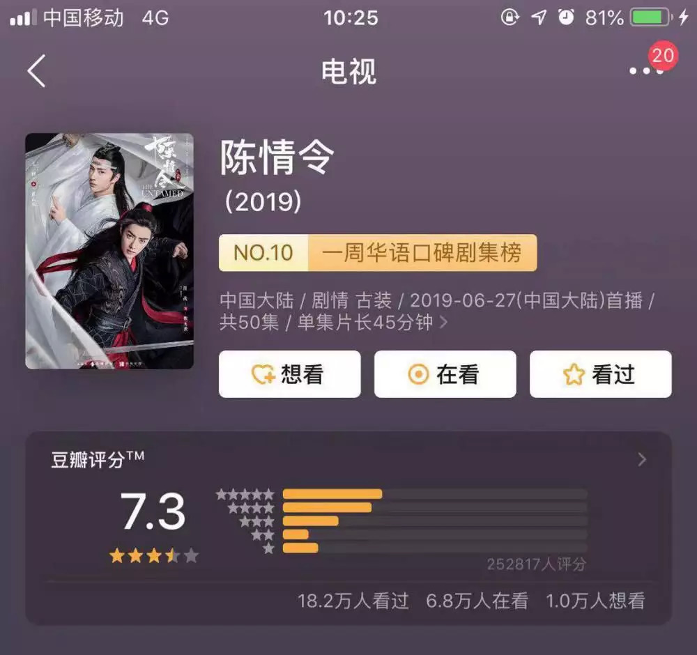 《陈情令》开拍前,就被原著粉和动画粉报复性恶评,大量粉丝到豆瓣词条下恶意拉低评分,以至于开播时,豆瓣评分只有4.8分。