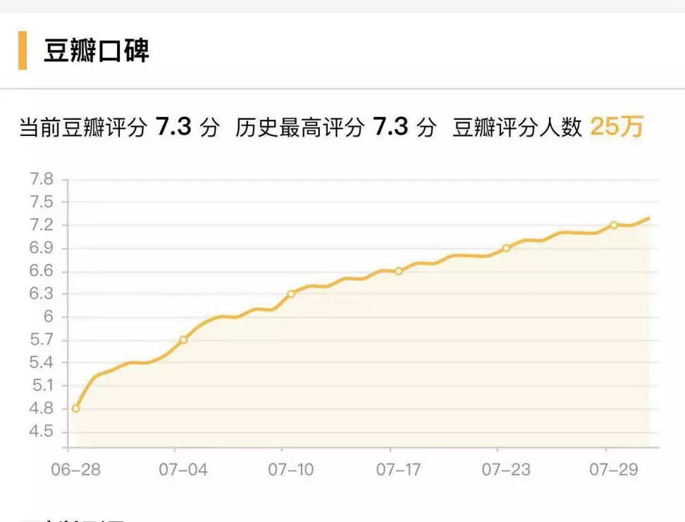 一周前,搜集资料时还是7.1分,但现已攀升至7.3分,目前评分人数已超过25万。