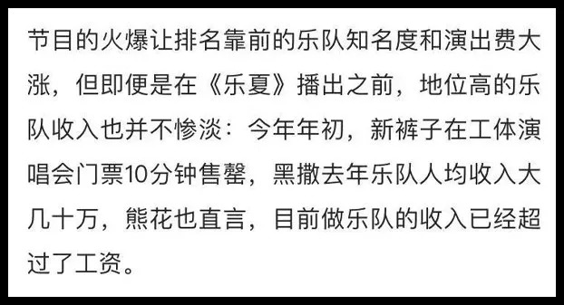 跟以往音乐综艺节目不一样的是,名次对《乐队的夏天》参演乐队没那么重要。乐队们不会节目结束以后就消声匿迹,上节目的结果就是令他们的收入更高,今后的路越走越宽。而不像其他音乐综艺类节目的草根选手们被迅速推入高速公路,没多久就抛锚了。