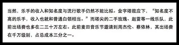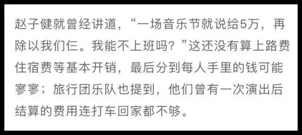 看这上图中的话,令人哭笑不得,都是 21 世纪了写这稿的人仿佛还活在前清。乐队去参加音乐节,还要自已掏路费和住宿费?只能说写这稿的人采访时可能睡着了。而演出后结算的费用连打车都不够,那是十几年前的事了