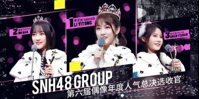 与去年万众瞩目的“登顶之争”不同,今年的第六届总选似乎落幕得悄无声息。比起去年直冲热搜第一的“李艺彤第一”,今年的“SNH48年度总决选”才堪堪停留在热搜第三名,被热播的《中餐厅第三季》《亲爱的,热爱的》稳稳压在身后。如大多数人预期的那样,去年总选披上象征冠军的赤红色披风的李艺彤,毫无悬念地以超过148万的票数连冠,并如同丝芭传媒之前所承诺的那样,因为连冠两年升级进入“明星殿堂”,未来将以个人身份在演艺圈重新出发。