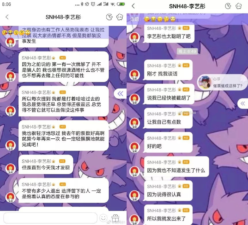 缺少了固定的对手,李艺彤的卫冕压力减小,粉丝的参选激情也被无形削弱。李艺彤甚至在SNH48的官方APP口袋48中透露,工作人员有向她透露票数情况,疑似存在催票意图,引发了饭圈内部争议。