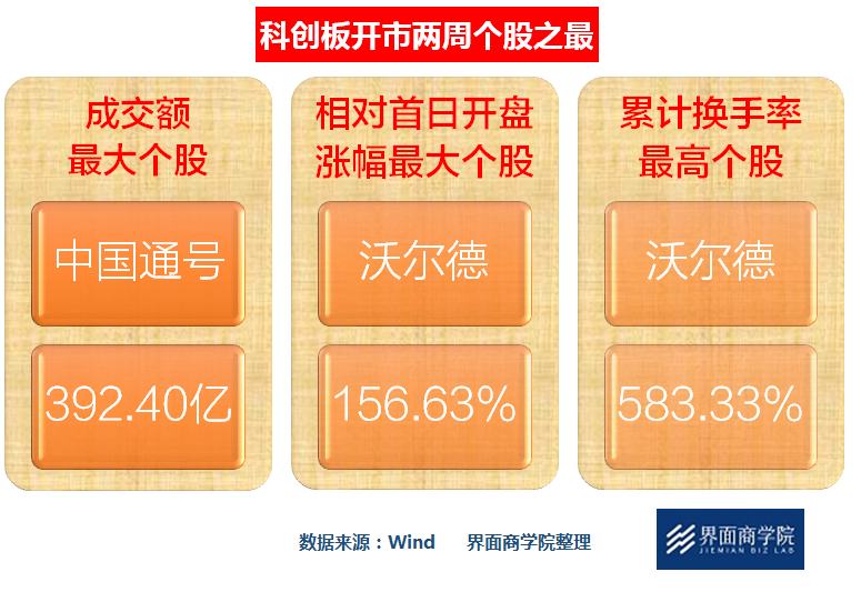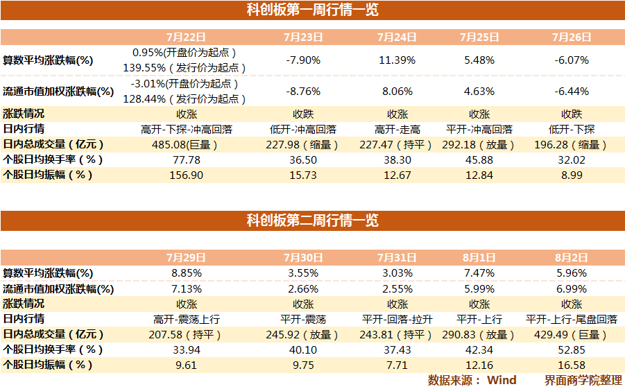 从市场指标中可以看到,科创板经历了第一周的涨跌互现、大幅震荡后,投资者在第二周形成合力,推动科创板持续上行。同时,日内成交量也在配合股价上涨同步放大,个股日均换手率以及振幅也同样呈现由低到高的趋势。