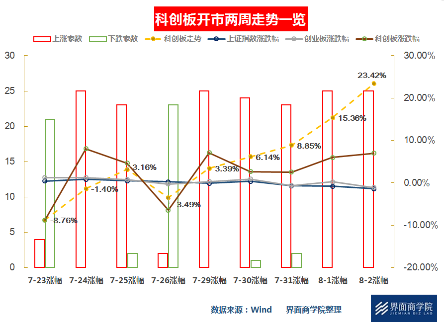 从整体走势上看,界面商学院对25只科创板个股日行情通过流通市值加权形成对科创板走势的参考,并与上证指数与创业板指对比绘制上图(首日波动较大未纳入)。图中,黄色虚线反映了科创板的整体走势,即科创板的累计涨跌幅,棕色线反映的是科创板的单日涨跌情况,即科创板的单日涨跌幅。柱形图为各日公司涨跌数量。