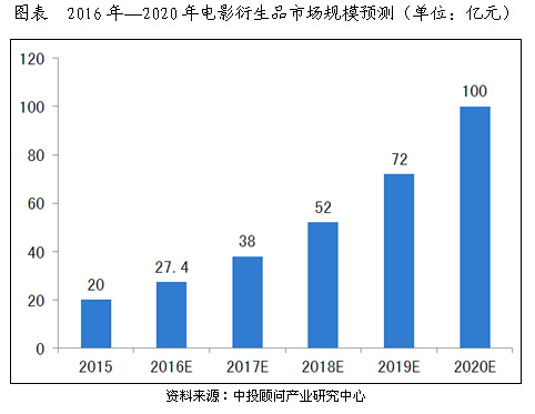 由于电影衍生品依附于电影,因此随着国产电影票房规模的不断扩大,衍生品市场实际是被看好的。据中投顾问产业研究中心预测,2015年至2020年国内电影衍生品市场规模将不断提升,2020年其市场规模有望超过100亿元。但实际上由于电影周期问题,衍生品真正能打开的市场空间并不大。