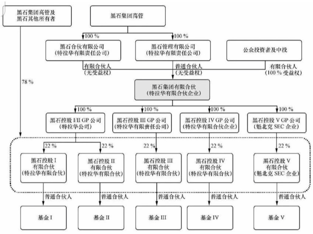 2007年,黑石集团在纳斯达克上市,成为第一家上市的美国PE巨头。由于PE业务的特殊性,同时也是出于避税的考虑,黑石设计了一套复杂的上市架构。简而言之,黑石集团的上市主体是一家有限合伙企业,在股票市场上发行和交易的,是这家有限合伙企业的LP份额。