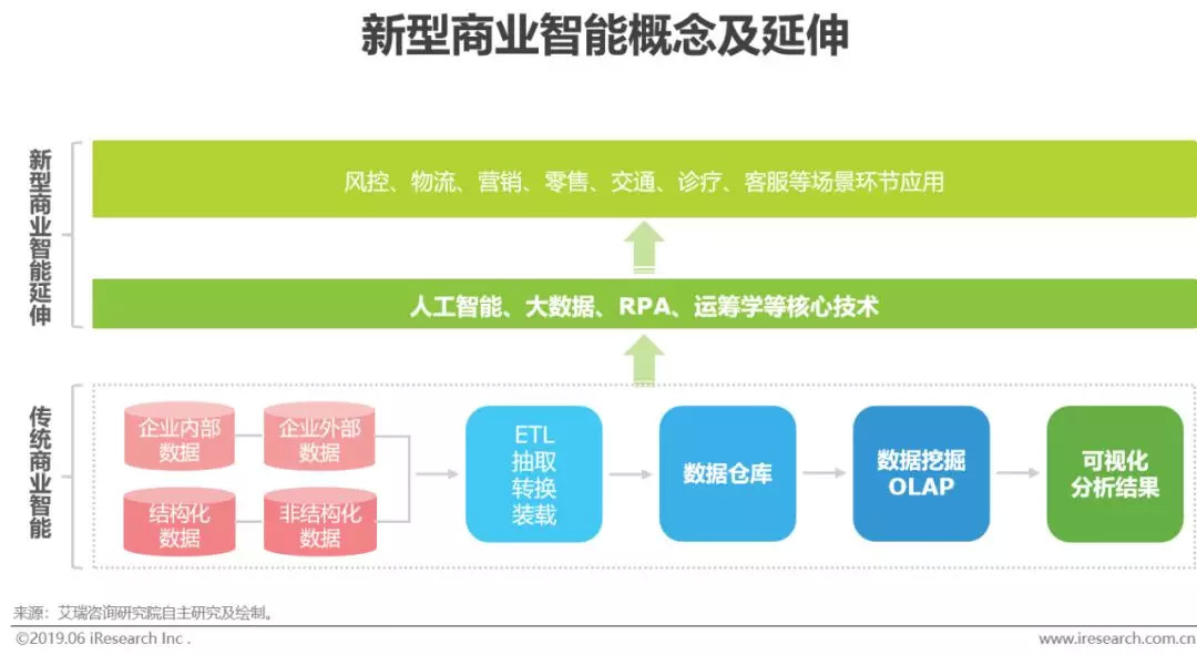 传统商业智能( Business Intelligence )是基于数据仓库、数据挖掘等大数据技术进行数据抽取、展示与分析,从而为企业实现商业价值提供支撑。艾瑞认为新型商业智能(Business + Artificial Intelligence)是在基于数据维度进行商业分析的层面之上,通过将人工智能核心技术(机器学习、计算机视觉、自然语言处理、智能语音交互、知识图谱)与大数据、机器人流程自动化(RPA)、运筹学等技术相结合,围绕商业活动中各典型关键环节进行洞察分析,并通过完整的解决方案级应用,推动产品创新与服务升级。本报告围绕上述界定的商业智能特征展开研究分析,描绘新型商业智能的应用现状、典型玩家布局及未来发展前景。