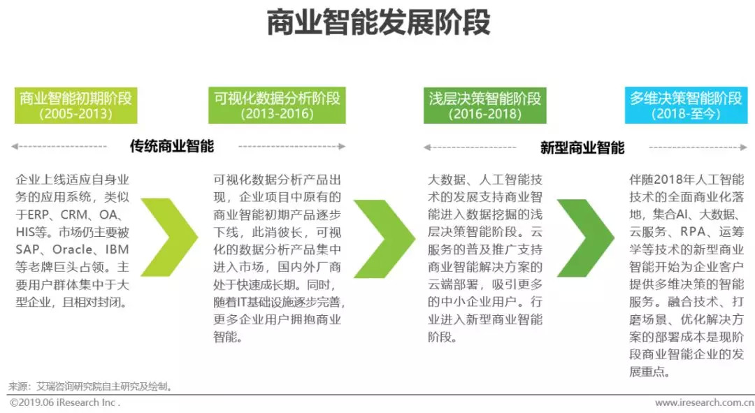 围绕数据分析与智能化技术的不断迭代创新,商业智能至今共经历四次变革,实现由传统商业智能向新型商业智能的转变过程。商业智能初期阶段用户主要集中于大型企业,产品智能化程度低且部署成本高。随着基础设施建设的日益完善与可视化产品的出现,大量国内外商业智能厂商涌现并迅速发展,推动商业智能技术普及应用。2016年开始,大数据、人工智能、云服务技术的革新发展推动浅层决策智能走向成熟,云端部署能力则吸引更多的中小企业用户,新型商业智能时代逐步开启。现阶段新型商业智能已进入快速成长期,技术融合有效增进了产品的多维智能决策能力,在不断优化解决方案能力的同时可有效降低应用成本。