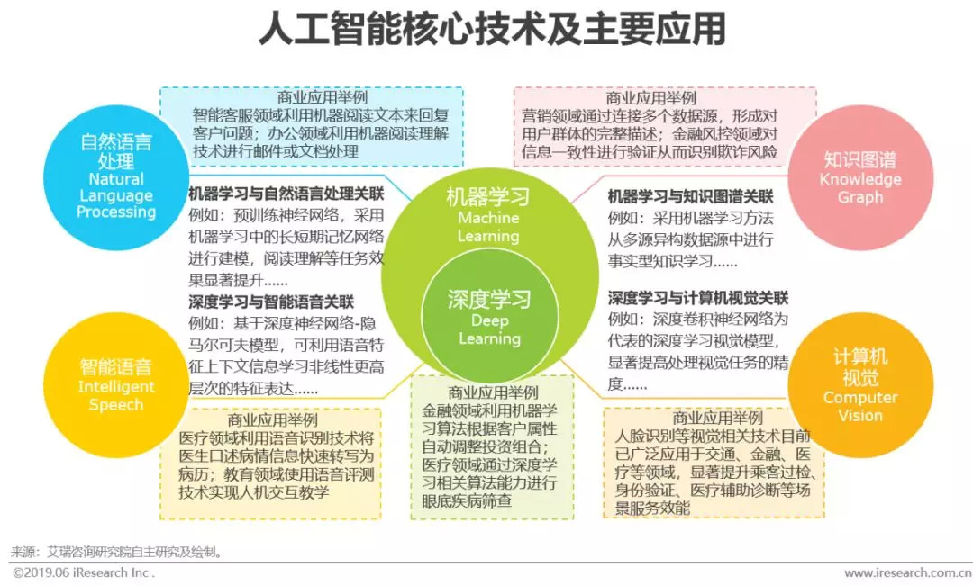 机器学习(含深度学习)技术作为人工智能的核心,近年来实现多方面的突破,如卷积神经网络、长短期记忆网络等多种机器学习/深度学习算法已经与自然语言处理、智能语音、知识图谱、计算机视觉等技术紧密结合,提升人工智能技术整体的应用效果。目前以机器学习为代表的人工智能技术在商业各领域(如金融、医疗、客服、零售等)实现了广泛应用,进一步降低企业经营成本,提升应用效能,提高终端消费者的体验,最终实现商业各领域的转型升级。