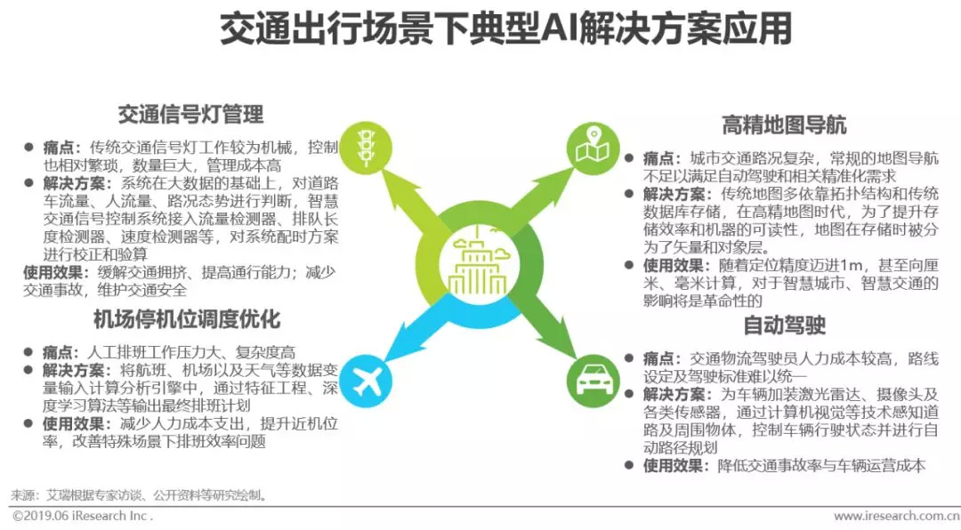 随着国民经济的高速发展和城市化进程的加快,公众出行需求逐步提升,与之带来的地面交通拥堵、机场车站人流密集、公共交通场站安全等问题层出不穷。人工智能、大数据、云计算等技术的崛起,正在重塑人、车、路之间的融合关系,强大的计算力与海量的高价值数据是构成多维度协同出行生态的核心力量。从应用场景来看,基于大数据技术和人工智能技术,现阶段商业智能主要应用于交通信号灯管理、高精地图导航、机位调度、自动驾驶、公共交通系统优化、停车位动态规划管理等方向,未来将形成实体道路与虚体网络的统一融合,建设具备统一数据接口的城市“交通大脑”,实现“以人为本”的全智慧交通系统。
