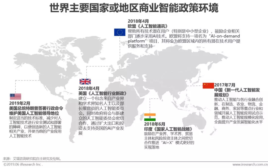 政策环境:美国、英国、欧盟等国家或地区的政策倾向于鼓励企业采用人工智能等新兴技术,但并未明确引导方向及发展领域。对比而言,国内政策更加落地,指明技术与场景落位方向。