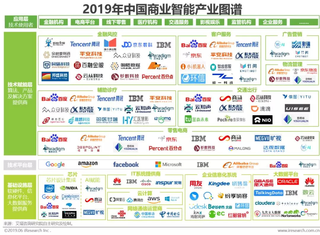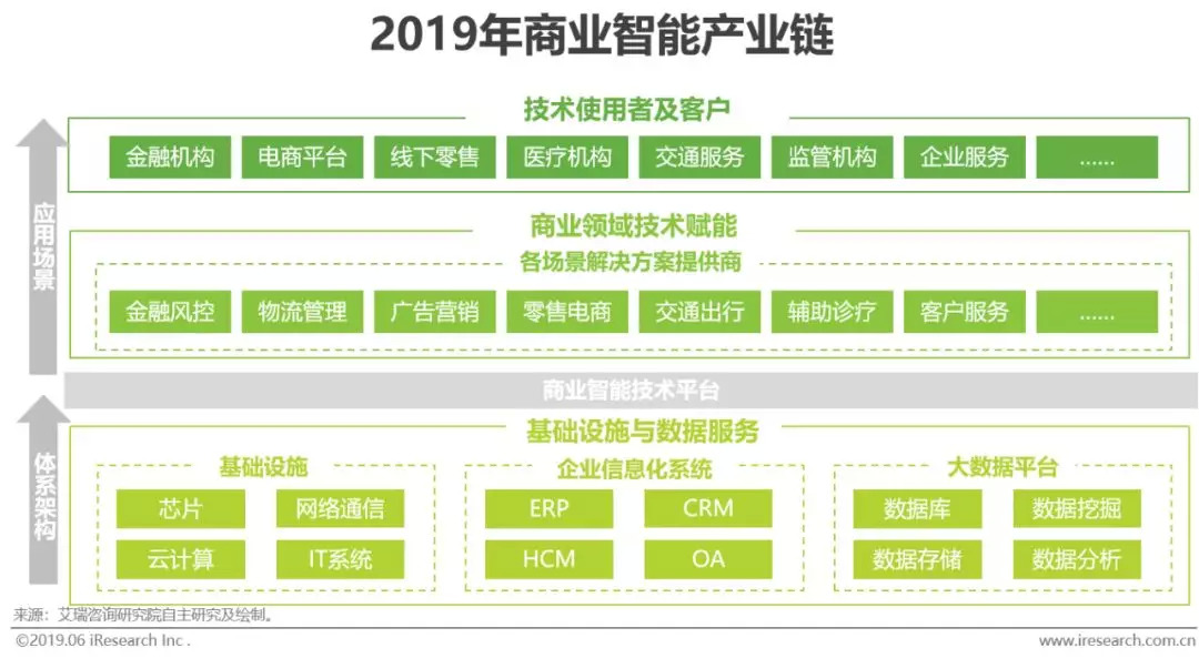 新型商业智能侧重于智能技术在商业场景和典型环节中的渗透应用,在产业链的中游解决方案提供商环节集聚了大量垂直领域的技术赋能型公司。同时,大多由互联网科技巨头领导布局的商业智能技术平台也可以充当产业链中游角色,为各商业场景/环节提供赋能效果。在产业链上游,传统IT厂商、云服务厂商、大数据平台服务商可为产业链中游技术提供者赋予计算、存储等基础设施支持, ERP、CRM等企业信息系统可帮助企业有效记录其资源及业务数据。