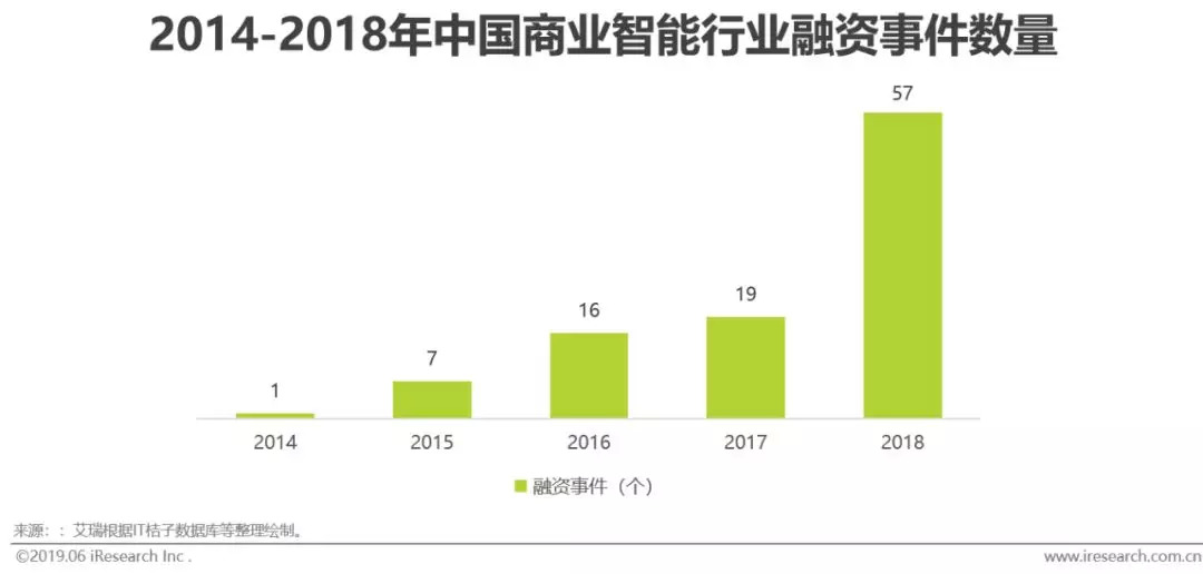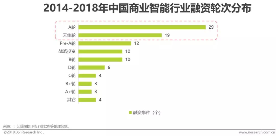 随着人工智能技术与商业场景融合发展进程的加快,该领域内的资本关注度随之增高,投资事件密集发生。2014年至2018年,商业智能领域累计发生融资事件100起,2018年最多达到57起,预计未来将保持稳定增长态势。从融资轮次来看,早期发展阶段的商业智能创业公司受关注较多,主要集中于A轮和天使轮,占比分别达到29%和19%。