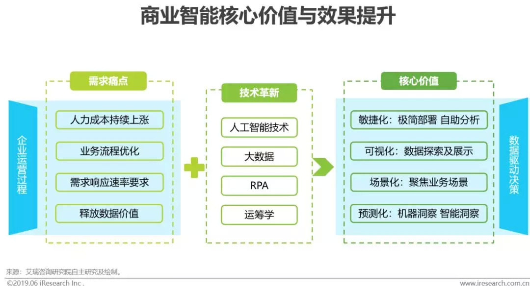新型商业智能基于多维度核心技术能力,旨在高效解决企业经营过程中面临的人力资本持续上涨、业务流程优化、需求响应速率要求、打通信息孤岛释放数据价值等企业运营痛点,以达到敏捷化、可视化、场景化及预测化的数据分析效果提升。依托数据挖掘、机器学习、流程自动化能力,技术提供方可以针对商业企业主营业务场景进行整体解决方案打包服务,对企业经营业务流程进行优化管理,聚焦商业活动需求进行预测性分析,辅助商业决策制定,以达到降本增效效果,提升商业环节的落地应用价值。