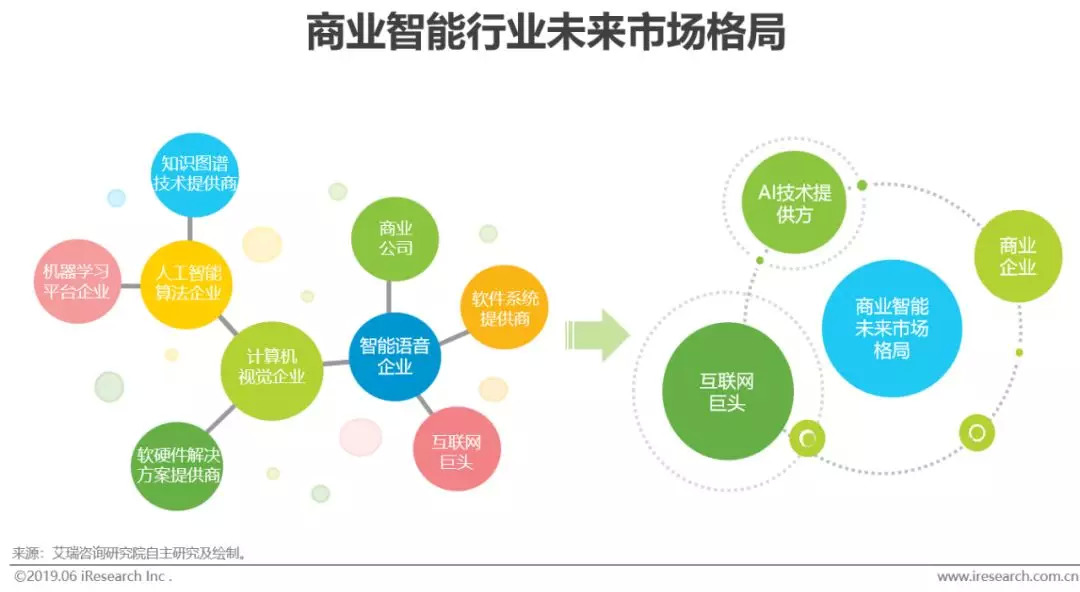 未来市场格局:互联网巨头、人工智能技术公司与商业公司将基于各自在流量、技术落地与行业认知方面的优势三方合力,共建商业智能全新发展生态。