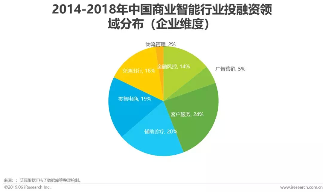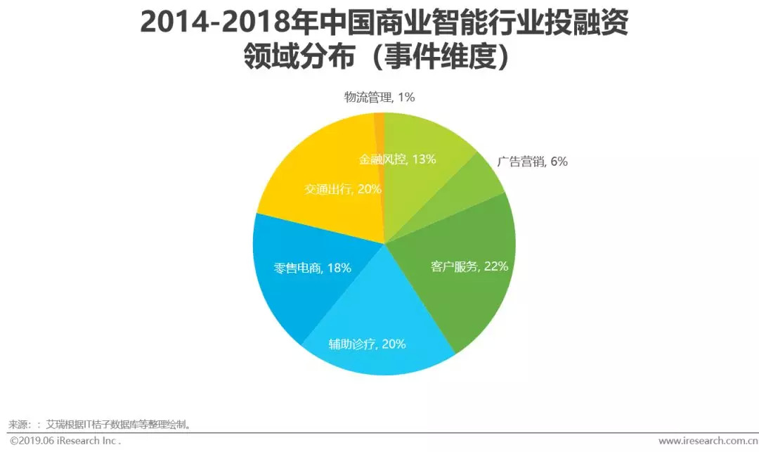 总体而言,商业智能行业投融资领域分布比较均匀,大部分应用场景均存在资本进入与发展空间。随着近年来语音机器人、外呼中心、自动工单管理等智能客服场景的快速发展与普及,智能客服赛道竞争日趋激烈,丰富的场景经验累积与良好的商业模式吸引了众多投资方关注。无论是从商业智能被投企业维度还是融资事件维度,客户服务类占比均最大,预计未来还将保持一定行业热度。此外,与公众生活密切相关的辅助诊疗、零售电商以及交通出行等领域也受到不同程度的重点关注。