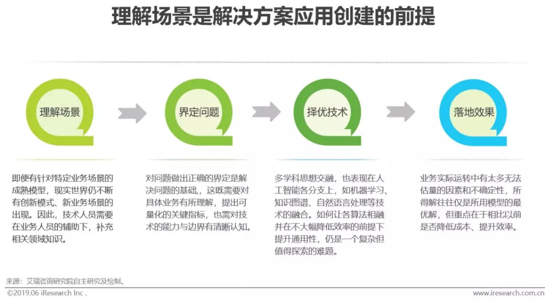 技术发展不断驱动商业智能行业发展转型,但在企业内部实践中, 对具体业务场景的理解、对实际问题的界定与采用何种模型或算法同等重要。对业务场景的深入理解在很大程度上决定了技术是否能够有效降低企业运营成本或帮助相关业务增加收入,这是技术能够落地、产业得以升级的关键。伴随着新型商业智能在多行业领域的实践应用,解决方案提供商逐步积累对细分应用场景的洞察,深入理解业务痛点,选择合理技术组合不断完善行业解决方案。