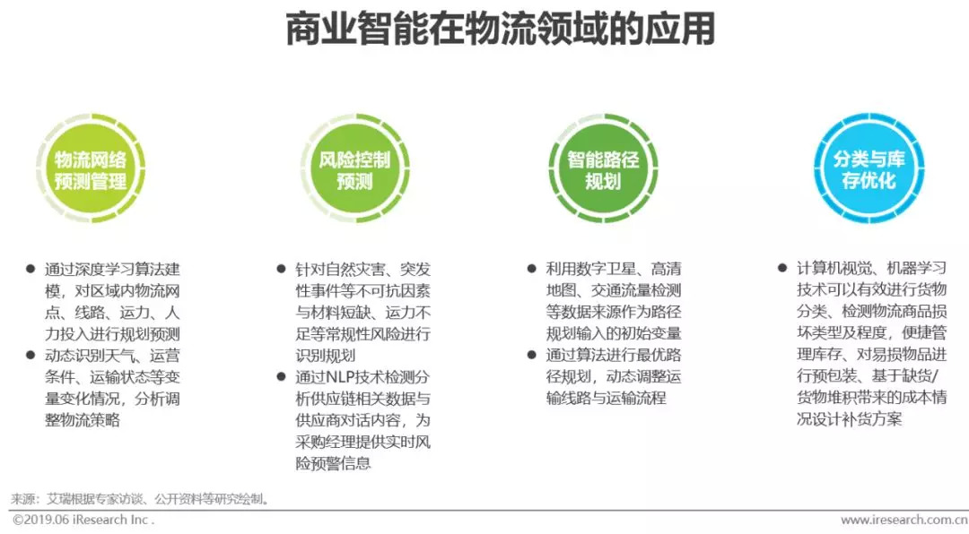 传统物流行业重度依赖人工为主的资源规划系统,服务种类单一且网络化水平较低,流通时间大多耗费在仓储环节,导致成本高企且效率低下。得益于供应链生产的海量实时数据,人工智能技术可以较好地与传统物流行业结合,助力物流企业实现数字化转型:在网络预测、风险控制及路径规划等后台业务方面,深度学习算法可以基于优化模型对策略进行动态规划,根据输入变量变化情况做出适时响应调整,并做出一定程度的预测推断;在仓储分拣等前台环节,计算机视觉、机器学习等技术可以帮助物流企业自动识别筛查货物分类及状态,实现便捷管理库存、自动补货等应用。