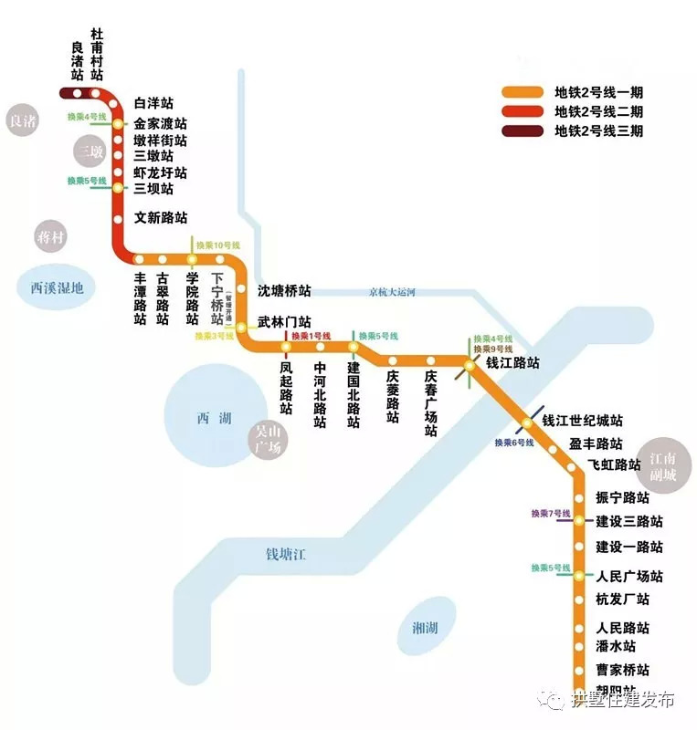 基本情况:地铁2号线西起余杭区良渚站,呈西北-东南走向,全部为地下线,贯穿良渚片区、钱江新城、钱江世纪城等,全长43.3千米,其中沈塘桥站、墩祥路站设在拱墅,已建成通车。