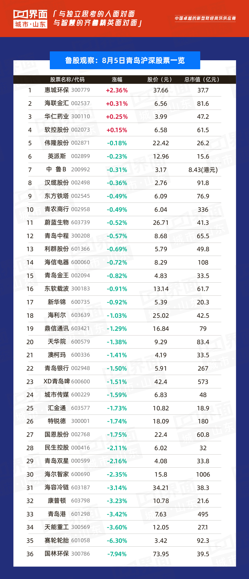 青岛市涨幅榜首:惠城环保(300779),涨幅2.36%,股价37.66元,总市值37.66亿元;