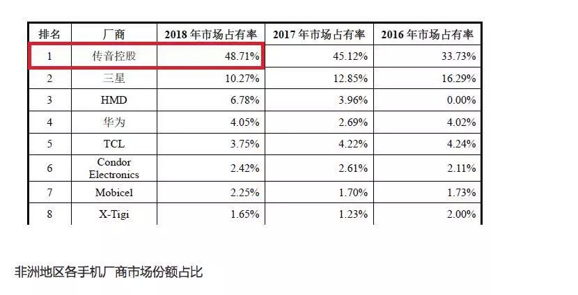 在传音招股书显示,其2018年在非洲市场占比为48.7%,第二名的三星则为10.27%。(不过根据IDC数据显示,在2018年的非洲智能手机市场上,传音、三星和华为分别以34.3%、22.6%和9.9%的市场份额位列前三)