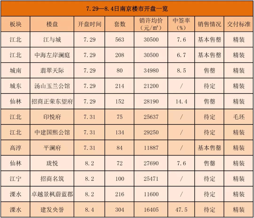 上周南京共有12家楼盘开盘,分布于江北、江宁、城南、城东、仙林、溧水、高淳七大板块,其中有6家楼盘公正摇号,中海左岸澜庭中签率最低,仅6.7%。此外,12家楼盘中售罄的为翡翠天际、招商正荣东望府、珑悦;江与城、中海左岸澜庭、平澜府基本售罄。