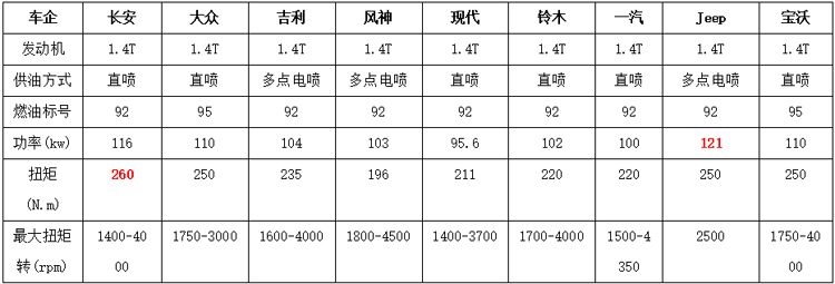 通过以上数据对比发现,Jeep的1.4T功率最大,121千瓦;长安的1.4T发动机扭矩最大,260牛米。在以上统计的所有1.4T发动机里,在发动机1400转时即可实现最大扭矩输出,真是不对比不知道,一比吓一跳。