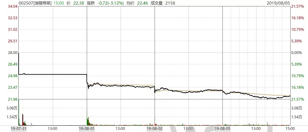 涪陵榨菜7月31日发布2019年半年报,2019年上半年实现营业收入10.86亿元,同比增长2.11%;归母净利润3.15亿元,同比增长3.1%;扣非后归母净利润3.12亿元,同比增长2.6%。2019年第二季度实现营业收入5.59亿元,同比增长0.6%;归母净利润1.60亿元,同比下降16.2%;扣非后归母净利润1.58亿元,同比下降16.9%。半年报公布后第二日,涪陵榨菜开盘一字跌停,四个交易日共跌去20.07%,显然对于涪陵榨菜的业绩变脸,资本市场很不满意。
