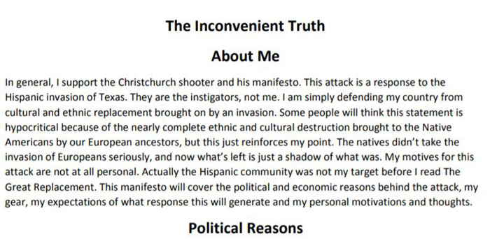 上周六,21岁的克鲁修斯(Patrick Crusius)在得克萨斯州的沃尔玛超市发动枪击前不到一小时,曾在8Chan上发布了四页长的个人宣言。克鲁修斯在宣言中明确支持新西兰清真寺枪击案枪手,称自己发动袭击是为了回应“拉美裔对得州的入侵”。