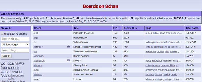 8Chan论坛中的内容全部为用户发帖,用户无需注册,可直接匿名发帖或者留言。根据不同内容,帖子被划入不同板块,每个板块有自己的标签。例如,/v/代表电子游戏板块;/k/代表武器板块;/trap/属于色情内容;/pol/为“政治不正确”板块。