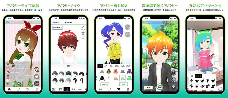 Mirrativ是由同名公司推出的直播平台,支持IOS和安卓。这款软件中有个名为“emomo”(エモモ)的功能,即能够扮演虚拟主播来直播的功能。Emomo提供了3D角色设计服务,能够更换脸部、发型、服装和背景。