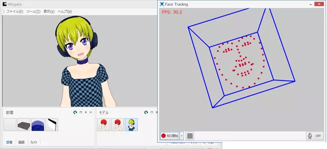 Hitogata(“人型”日语的罗马音)是由mogg个人开发的简易脸部识别软件,仅支持PC。这款软件比FaceVTuber的捕捉范围更广一些,它能够解析脸部表情(嘴部、眉毛、眨眼)和上半身动作,若配套使用身体捕捉工具“PerceptionNeuron”的话还能够支持解析全身动作。关于口型的呈现,除了能用摄像头识别以外,还能够通过麦克风声音大小来控制。