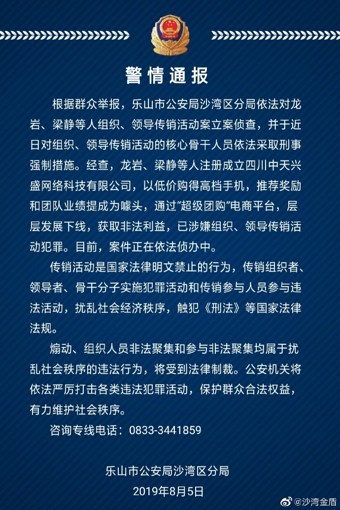 四川省乐山市公安局沙湾区分局通报,根据群众举报,乐山市公安局沙湾区分局依法对龙岩、梁静等人组织、领导传销活动案立案侦查,并于近日对组织、领导传销活动的核心骨干人员依法采取刑事强制措施。经查,龙岩、梁静等人注册成立四川中天兴盛网络科技有限公司,以低价购得高档手机,推荐奖励和团队业绩提成为噱头,通过“超级团购”电商平台,层层发展下线,获取非法利益,已涉嫌组织、领导传销活动犯罪。目前,案件正在依法侦办中。