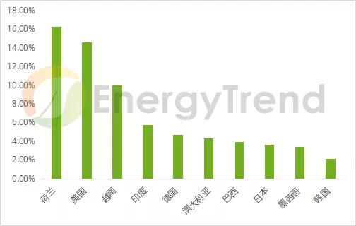 依国别来看,前五国出口金额占比50%。其中荷兰、德国、韩国排名稳中有升,荷兰市场超过出口局势摇摆不定的美国市场,登顶榜首。越南市场经过上半年630抢装,其出口金额占比已有下行趋势。同时企业出口国家分布进一步分散化,未来海外新兴市场与复苏的欧洲市场已成企业角力要点。