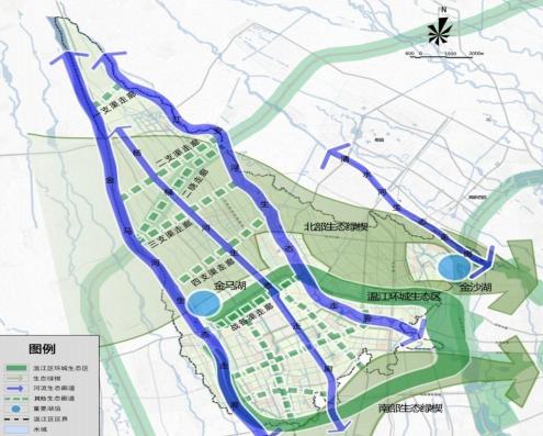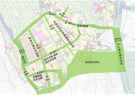 根据《温江区城市总体规划(2014-2020 年)》,在“南城”区域“引林入城,引水入城”,规划两横两纵的生态走廊,形成组团化发展格局。金马板块不仅被金马河生态湿地与温双楔形绿地包围,板块内部“新华大道-温泉路生态走廊”、“成新蒲铁路生态走廊”、“锦绣大道生态走廊”纵横交错。