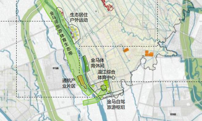 金马板块最大的生态优势便是其“金马河旅游体育生态带”, 依托金马河良好的生态资源,将打造多个健康旅游产业簇群,温江规划中的四处市级体育设施有三处位于金马板块,包括国际马术中心、水上训练应急配套项目、综合体育中心。