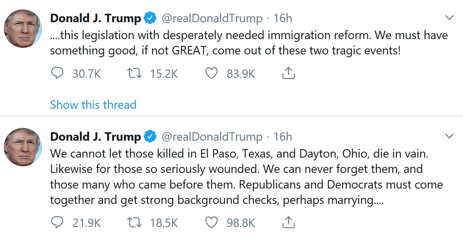 在更早前的另一条Twitter里,他强调:“我们不能让那些在德克萨斯州埃尔帕索和俄亥俄州代顿遇害的人白白牺牲。对于那些受重伤的人来说也是如此……共和党人和民主党人必须齐心协力,进行强有力的背景调查,或许将这项立法与迫切需要的移民改革结合起来。我们必须有好的东西(即使不算伟大)来走出这两场悲剧事件!”