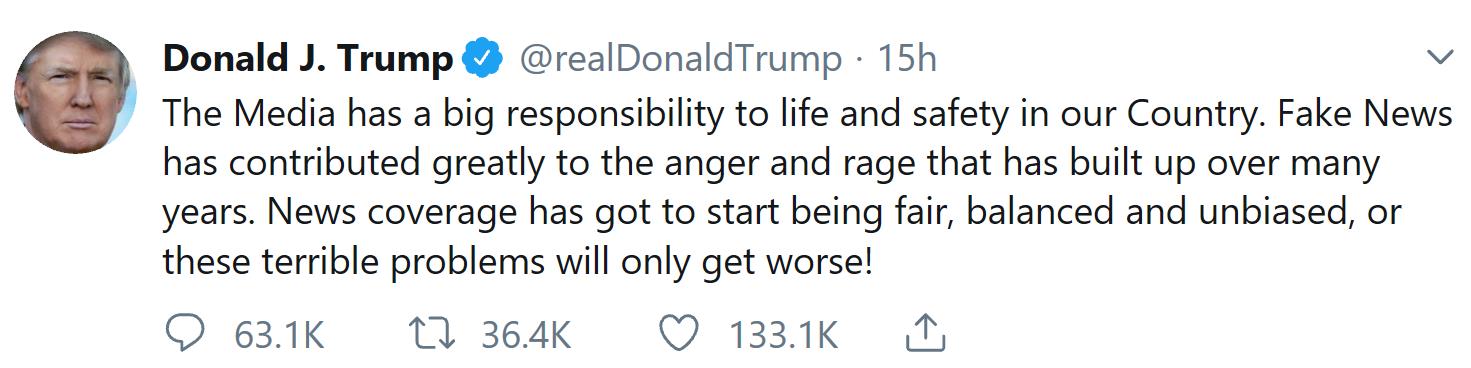 发表讲话前,特朗普还在Twitter上把仇恨意识归咎于“假新闻媒体”:“在我们国家,媒体对生命和安全负有很大的责任。假新闻极大地助长了多年来积累的愤怒和愤怒。新闻报道现在必须开始公平、平衡和公正,否则这些可怕的问题只会变得更糟!”