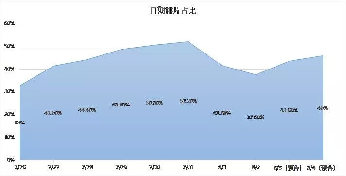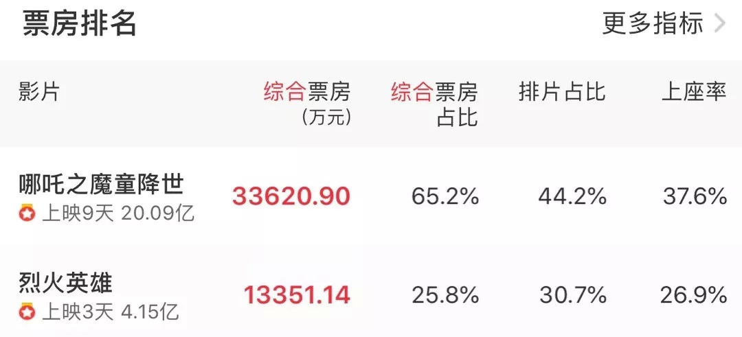 票房背后,是《哪吒》的高排片场次,最高排片占比甚至超过了50%,这对一部动画电影来说是极其罕见的。尽管8月1日上映的《烈火英雄》分流了一部分哪吒的票房,但到了周末,哪吒的排片率又迎来了反弹。