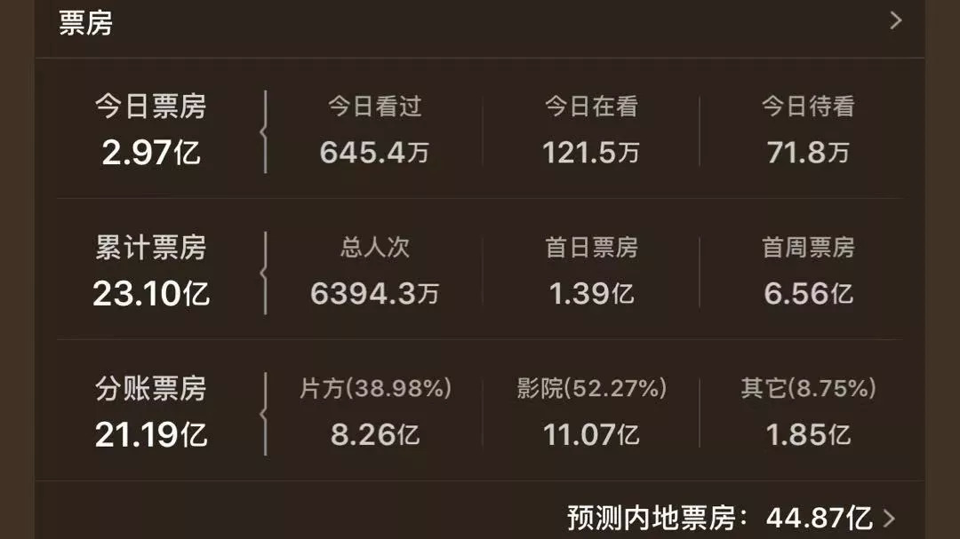 猫眼电影预测,其内地票房或将达到44.87亿元。