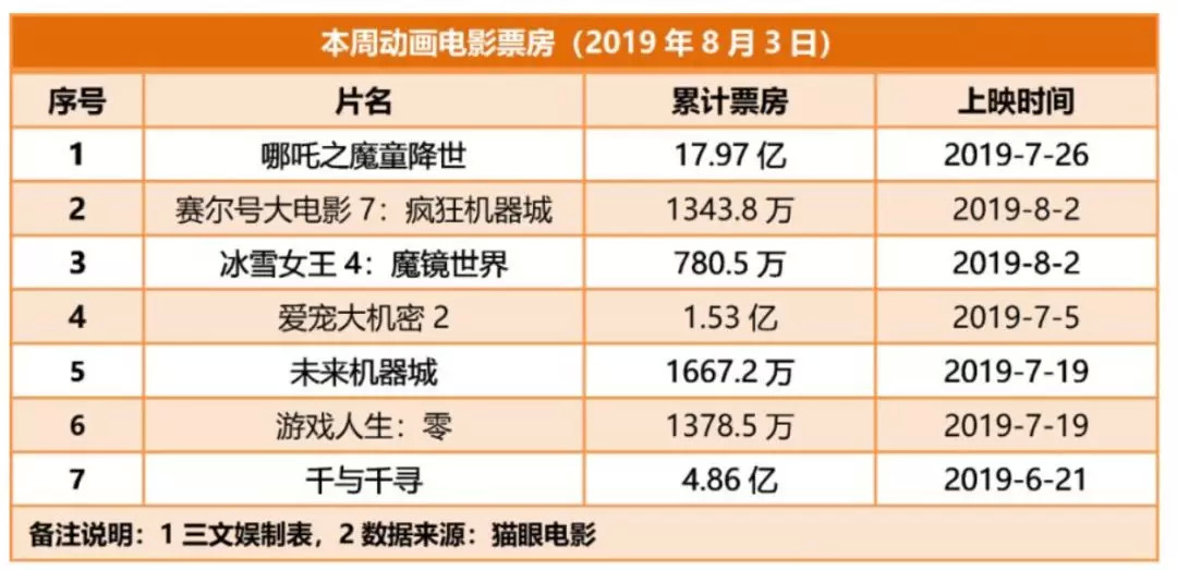 动画电影方面,《哪吒之魔童降世》无悬念领跑周票房榜单,目前上映9天,截至8月3日12时,累计票房达17.97亿元,该片也在8月2日成功超越了《疯狂动物城》,登顶中国影史动画电影票房排行榜。《赛尔号大电影7:疯狂机器城》与《冰雪女王4:魔镜世界》在8月2日同日首映,首映票房分别为571.8万和476.5万,目前累计票房分别为3967.2万和794万元。