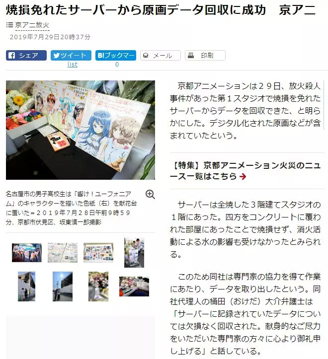 据日本媒体报道,京都动画的原画纸质资料几乎全部被烧毁,但位于一楼的服务器未被烧坏,在专家的帮助下,服务器中的原画数据已成功恢复。这些数据包括部分已电子化的原画、分镜以及部分新作的资料。除此之外,京都动画还在火灾前夕为举办画展,向日本德岛市一个书店寄出了70件原画,这些作品由此幸免于难。