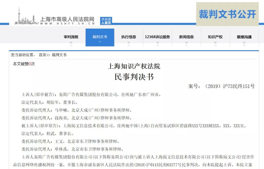 上海知识产权法院对易简广告涉《择天记》信息网络侵权案进行了终审判决:驳回易简网络上诉,维持原判结果,即易简广告赔偿阅文公司经济损失人民币120,000元。