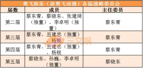 7月31日,奥飞娱乐股份有限公司第五届董事会第一次会议中确定了第五届战略委员会的人员名单,包括蔡晓东、孙巍、李卓明,其中李卓明为独立董事。与上届比,本届名单中的3名委员都发生了变化,蔡东青的弟弟蔡晓东首次成为了战略委员会的主任委员。