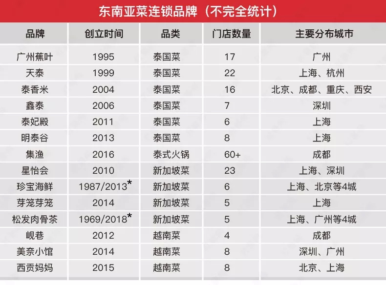 东南亚菜进入国内的时间虽然不晚,但至今没有全国性连锁品牌出现,大部分品牌仍局限在区域市场发展。
