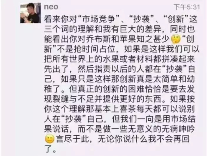 但聂云宸在此条朋友圈下回复也理直气壮,表示二人对“市场竞争”、“抄袭”、“创新”的理解有巨大差异。