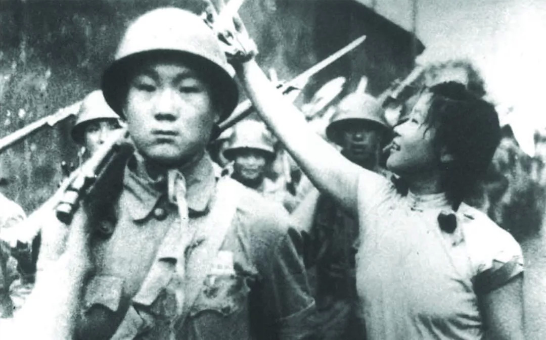 1949年7月6日,上海举行军民大游行,欢天喜地庆解放。一位上海姑娘把鲜花挂到了解放军战士的枪上。