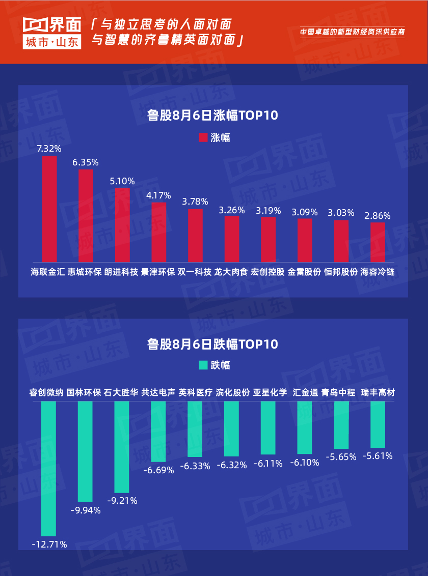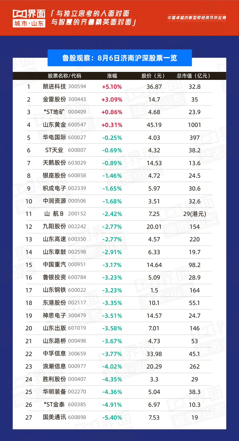 8月6日,山东省内沪深股票有27只个股看涨,174只下跌,5只与上一个交易日收盘价持平,无涨停个股。